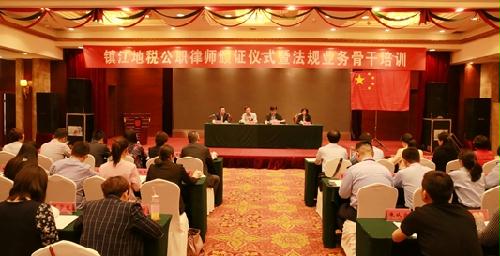 5月8日,镇江市地税局在丹阳市组织了全市地税系统第二批公职律师颁证仪式暨法规业务骨干培训班。会上,省局政策法规处处长徐怀庚向全系统5名同志颁发了第二批公职律师证书,镇江地税局公职律师团队共6名同志,面对国旗进行了庄严宣誓,镇江市律师协会会长金荣见证了颁证仪式。